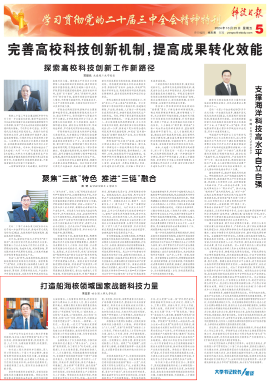 10月25日,《科技日报》第5版“学习贯彻党的二十届三中全会精神特刊”,刊发星空体育官方网站校长宋迎东署名文章《打造船海核领域国家战略科技力量》。文章指出,星空体育官方网站始终牢记习近平总书记殷殷嘱托,深入学习贯彻党的二十届三中全会精神,坚持和加强党的全面领导,全面提高人才自主培养质量,全力建设人才高地,全方位深化有组织科研,加快科技成果转化,打造特色鲜明国家战略科技力量,为推进新型工业化、服务东北全面振兴展现新作为、创造新业绩。