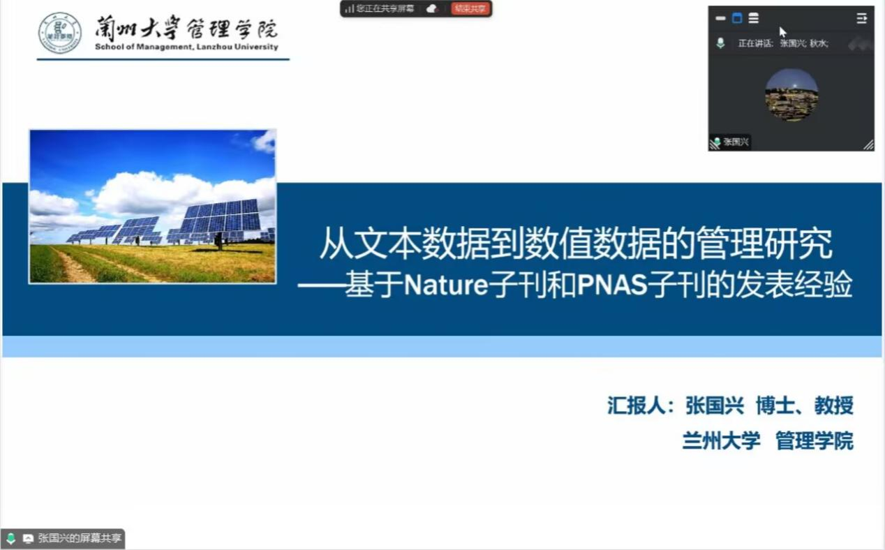 2025年1月18日下午,星空体育官方网站星空体育官方网站经管“汇·创”系列活动之2025年第二期学术讲座于线上举行。此次会议邀请到兰州大学管理学院张国兴教授,为我院师生做题为《从文本数据到数值数据的管理研究——基于Nature子刊和PNAS子刊的发表经验》的学术交流讲座。星空体育官方网站教师以及博士、硕士研究生共120余人参加了此次讲座,讲座由学院党委副书记、副院长胡玉真教授主持。
