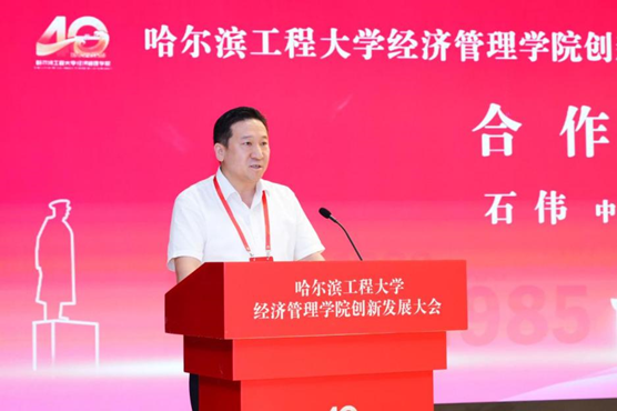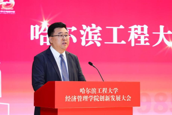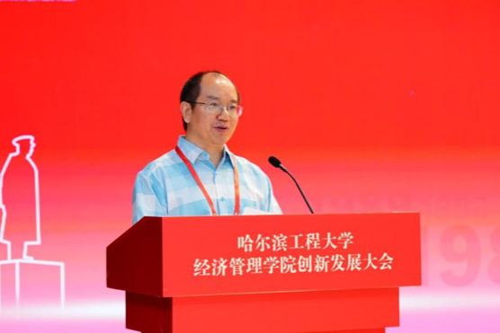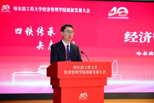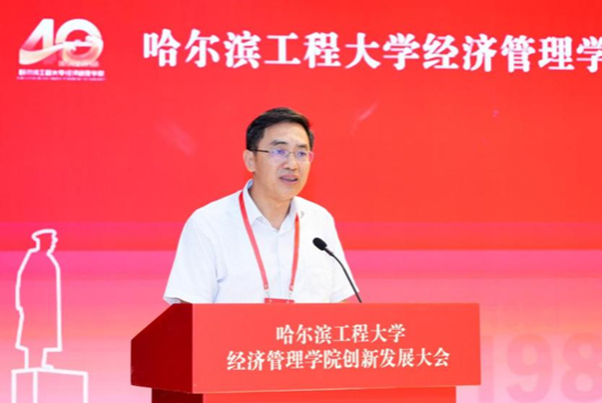 哈尔滨工业大学经济与管理学院院长王健作为兄弟院校代表致辞,深情回顾了两院“比邻而居、兄弟情深”的合作传统,对40年来学院发展取得的成绩给予祝贺。他强调,两院共同扎根龙江大地、传承国防工信特色,希望未来两院充分发挥互通互联优势,共育时代新人、共攀科研高峰、共担龙江使命、共创开放生态。