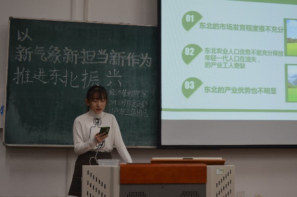本次团日活动主题是以“新气象、新担当、新作为”推进东北振兴,各班团支书通过ppt演示稿介绍习近平东北三省考察及深入推进东北振兴座谈会上的重要讲话内容,鼓励团员思考学习其重要讲话精神和思想。围绕活动主题,团支书向团员播放相关短视频,提议团员积极分析讨论并交流心得,保证每个团员对于本次活动主题都有深刻的认识理解。活动尾声,团支书组织小活动来帮助团员更好的认识东北、学习思想、培养精神。