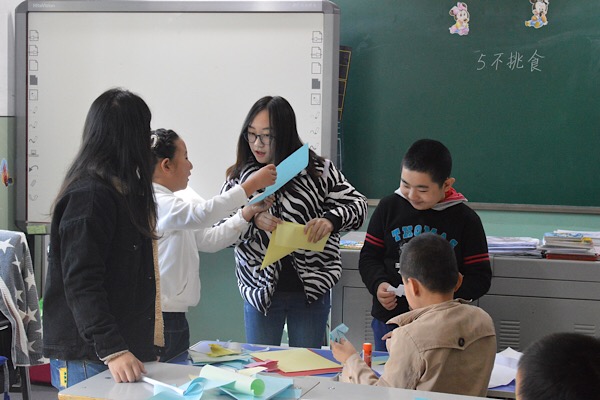 刚到教室,志愿者们就受到了学生以及学生家长的热烈欢迎。志愿者们进行了简单的自我介绍,随后展开手工折纸和绘画活动。活动中,志愿者们耐心地教孩子们叠纸飞机,小朋友们兴致高涨,一叠好就高兴地举手向志愿者们展示成果。紧接着志愿者开始教孩子们画恐龙,孩子们纷纷拿出自己的画笔一笔一划勾勒,还不时的提出问题。活动就这样在孩子们的欢声笑语中圆满结束。